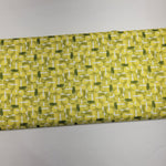Patterned fabric with geometric design in yellow and green on a ruler background