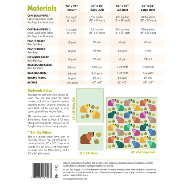 About this Pattern: Join the Capybara Club! These patchwork cuties are made using fat quarters and conventional piecing techniques. No templates or paper piecing! Pattern includes instructions for making a 36” x 45” Baby Quilt with two capybaras, a 58” x 66” Lap Quilt with 12 capybaras, or an 82” x 84” Large Quilt with 24 Capybaras. The pattern also includes instructions for making a 24” x 24” quilted pillow cover. The capybara blocks in all quilt sizes are made with fat quarters. The quilt also includes plant blocks, which are pieced with yardage of two different plant fabrics. Please refer to the pattern back for a complete materials list and yardages. Solid and/or small, non-directional fabrics are recommended. This is a patchwork quilt pattern. (No templates or paper piecing are used.) The projects in this pattern include some small pieces and are recommended for quilters familiar with rotary cutting and patchwork piecing.