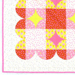 About this Pattern: "I designed this quilt while thinking of the twinkly night sky. The quarter circle block is perfect for forming a sweet little twinkle shape. I combined fabric colours to create a gingham effect, as though the fibre colours were interwoven. Thus, the happy marriage of gingham and glitz!" - Holly