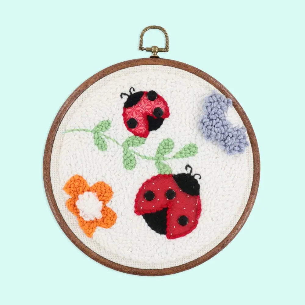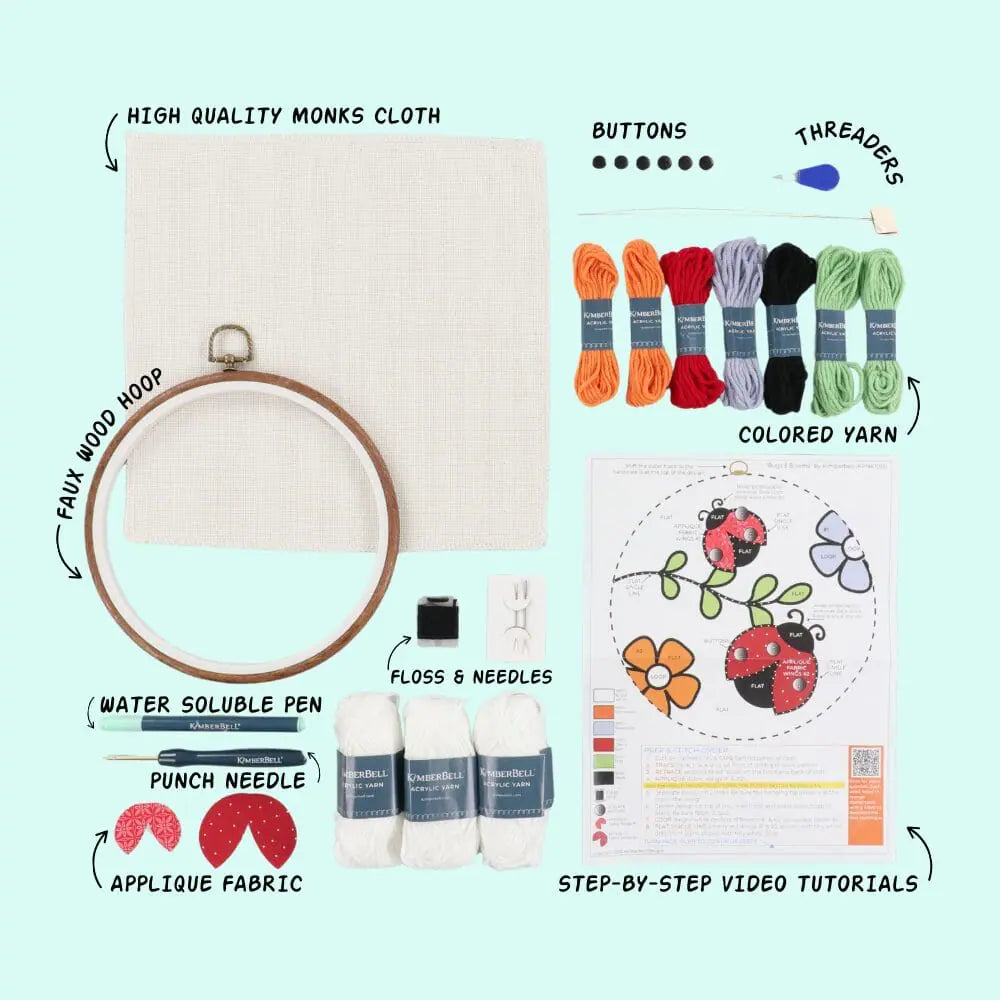 About this Item: Our new design is as cute as a bug! Kimberbell’s Bugs & Blooms Punch Needle kit includes all the supplies you need to completely finish your project, including the tool, monks cloth, yarn, frame, applique fabric, and detailed video tutorials. Punch two adorable ladybugs with applique wings, add lovely flowers and leaves, and slip into our round faux wood frame!