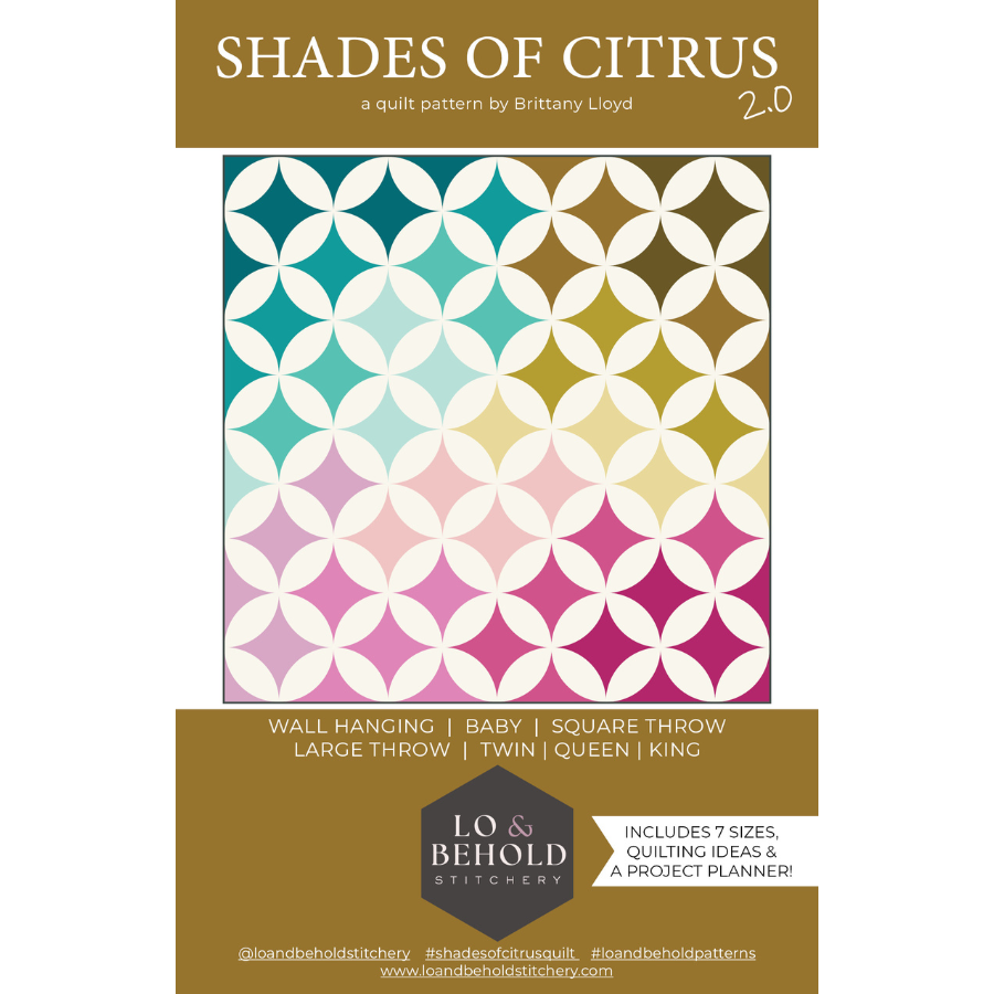 About this Pattern: Shades of Citrus 2.0 is an updated version of one of Lo & Behold Stitchery's most beloved original patterns. This new version keeps the heart of the design intact, while also adding several extras including seven quilt sizes, easy to follow construction, quilting ideas, a project planner, labels, and new color inspiration. Paper templates are included with the pattern or acrylic templates are available
