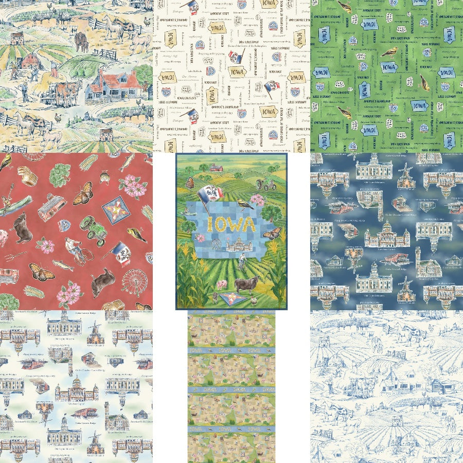 This year’s fabrics feature a large panel with a scenic view of the state’s rolling countryside. A similar panel of stripes has a large band of Iowa maps alternating with a narrower Iowa strip. Complementing the panels are prints with themes such as farmlands, icons, Iowa’s best, landmarks, and an “I Like You” word toss. Ten blender fabrics of a subtle monochrome print round out the collection.