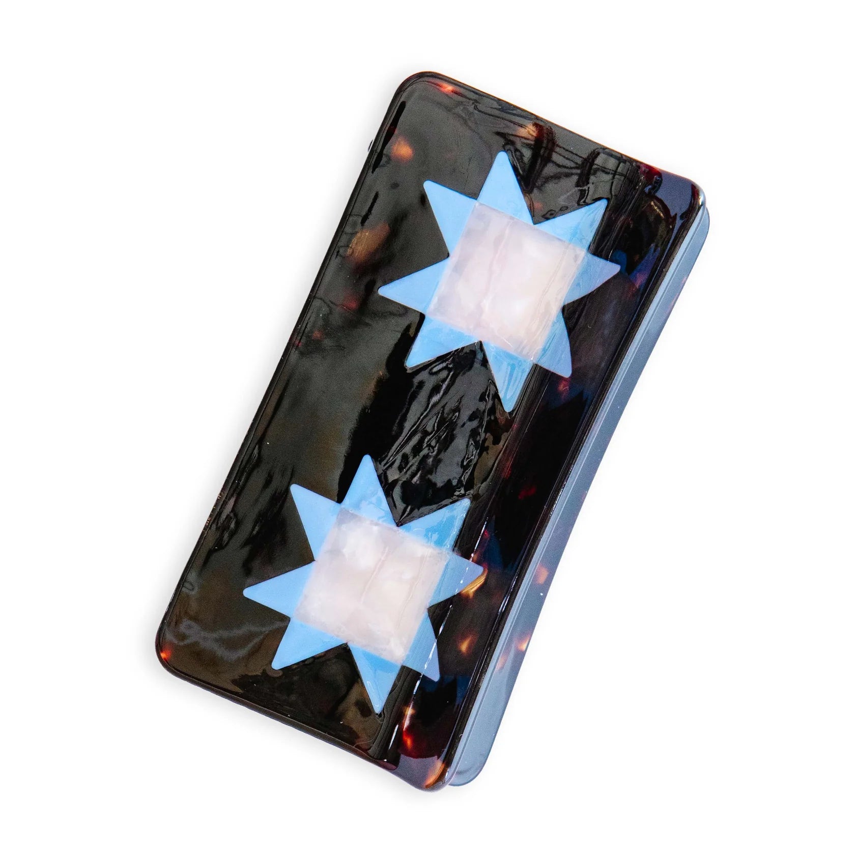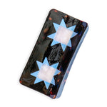 This oversized rectangular claw clip features a classic quilt block design with a tortoise shell exterior with blue and cream sawtooth stars that pop. Built larger and stronger to grip thick hair, it's both functional and a conversation starter. Perfect for quilters, sewists, and anyone who loves bold, handmade-inspired accessories.